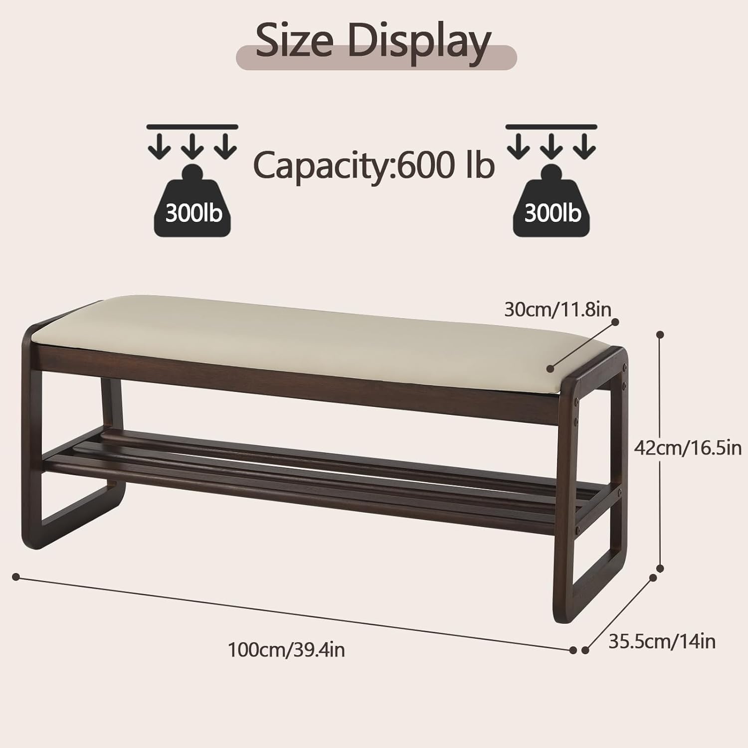 Mid-Century Modern Sheesham Wood Entryway Bench with White Cushion - 2-Tier Storage and Seating for Dining Room, Living Room, or Bedroom